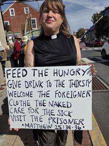 The all-age crowd chanted “Love, not hate, makes America great,” and voiced some call and response chants while cars beeped their approval on the busy street.