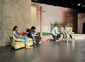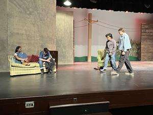 PRESS PHOTO BY MICHAEL HIRSCHAinsley Quay as Two-Bit, Jordan Silver as Sodapop, Deven Ruiz as Ponyboy and Gavin Sachse as Darry rehearse a scene from the play “The Outsiders.”