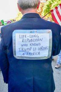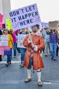 They carried American flags and catchy signs addressing issues such as immigration enforcement, voting, dictatorship, a threatened democracy, tyranny, adhering to the U.S. Constitution and marginalized groups who have come under fire from the president. At times they chanted “no kings” and some marchers dressed in costumes. They were a mix of young and old.