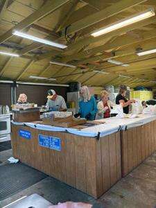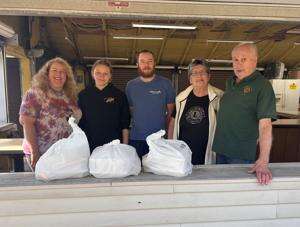 CONTRIBUTED PHOTOSVolunteers Carol Bodnar, Carson Smith, Kim Decker, Sue Smith and Wendy Heintzelman assemble the dinners for the Allentown Kuhnsville Lions Club chicken barbecue. Customer were served a half chicken, baked potato, applesauce, roll and butter for pickup or eat in. This is one of the largest fundraisers for the Allentown Kuhnsville Lions Club.