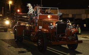 An antique 1935 REO Speedwagon Forest Fire Combination Pumper that originally served Shutesbury, Mass., moves down Chestnut Street during Coplay Borough’s annual Halloween parade Oct. 21.