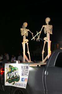 Two skeletons spar in a float for Viper Martial Arts, Coopersburg.
