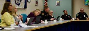 During the Oct. 15 Coffee and Conversation event, a panel of township officials field residents’ questions and concerns with the intention of bringing the issues back to their respective boards to help guide decisions that affect the community. Seen here are Salisbury Township School District Superintendent Lynn Fuini-Hetten, Chief Financial Officer Dawn Nickischer, Township Manager Cathy Gorman, Police Chief Don Sabo, resident Sally Banko, Lt. Chris Casey and School Resource Officer Richard Nothstein.