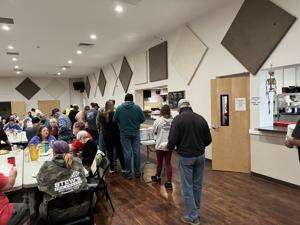 The all-you-can-eat line grows longer as the morning goes on. Volunteers from the Parkland High School Leo Club bus the tables at the breakfast.