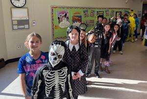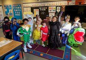 Students are resplendent in their costumes as they gather for a photo in a classroom at Salisbury Elementary School Oct. 24.