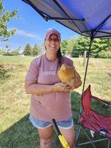 About 100 chickens, a dozen geese, guinea fowl, goats, horses, a dog, cats, and bees (with hive) live at Sunset Stables.