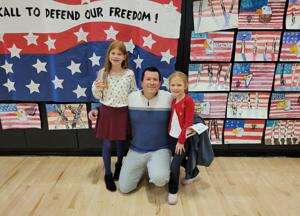 Scott S. with his girls Quinn and Norah enjoyed the patriotic songs, student letters and family time. Applause filled the gym.