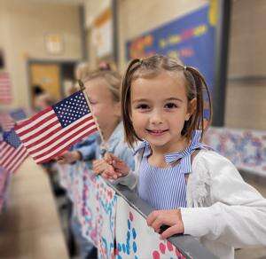 PRESS PHOTOS BY ERICA SEITHERBrooke D. along with some fellow first graders, and kindergartners, warmly welcomed guests by waving flags while thanking them for their attendance and for their service. More photos on A2.