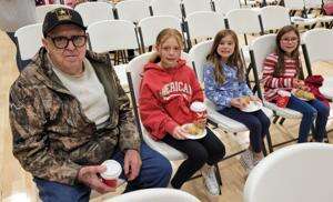 The beautifully decorated gym set the stage for the patriotic Veterans Day program. Larry Leibensperger along with nieces Emma, Everly, and Hannah V. enjoyed refreshments and community fellowship afterward.