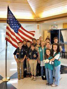Scouts Dean K., Logan F., Sawyer S., Eli Y., Ryland P., Axl L., Harrison K., Ella M., Landyn P., Annalise C., Rowan T., Hannah P., and Noah W. placed the flag in the rotunda after the assembly.
