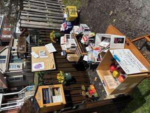 Now our library is a bit different. At its feet are a dozen or so small cardboard boxes also containing books – Ha! nothing fancy, you’ll recognize take out boxes from Pottsie’s Hot Dogs! – books broken down into such categories as Art, Best Sellers, Humor, Black Literature, the Epstein Scandal, and Bethlehem and Vicinity.