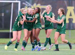 PRESS PHOTO BY MARK LINEBERGEREmmaus players celebrate Lizzie Bender’s goal during the District 11 quarterfinals.