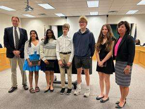 East Penn School District Board of Directors President Dr. Joshua Levinson and Superintendent Dr. Kristen Campbell join National Merit Scholarship commended students Anisha Kundu, Maitreyi Kukade, Thomas Amdur, Nathaniel Peters and Marleigh Llewellyn for a photo at the board of directors meeting.
