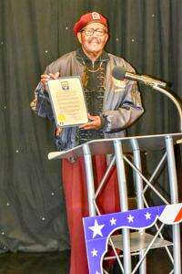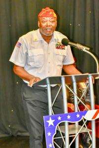 Guest speaker Michael Carter, a retired Warrant Officer in the U.S. Navy and member of the Marine Corps League, related a lesson taught to him by his World War II veteran father. “My father told me he had to fight to fight,” drawing attention to the placement of Black servicemen and women in more supportive roles in the service during that time.