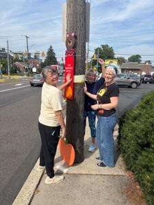 Audrey Erb, Barb Martin and Angela Faidley install bears along Macungie’s Main Street. These bears were handmade and hand-painted by members of the committee. Borough residents were invited to “sponsor” a bear. The sponsor’s name was then added to the bear. According to the borough website, Macungie takes its name from the Lenape Indian phrase describing “the feeding place of the bears.”