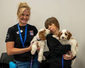 The most popular attraction at the Cetronia Ambulance Corps Health Expo is the Tails of Valor 6-week-old goldendoodles “Wally” and “Flash,” held by Heather Lloyd and Andrea Town.