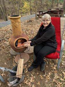 Santa’s elegant carriage is kept in a special tent-barn. Fran Getz, a volunteer from North Catasauqua, sat close to a chiminea whose fire kept her warm as she staffed the Santa carriage barn. She was a greeter, as the barn is at the end of the parking lot before one enters the complex.
