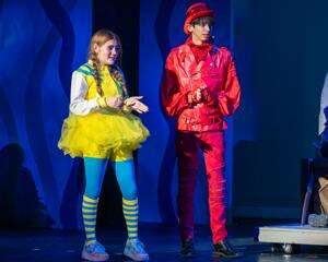 Flounder, played by Noelle Rauch-Mannino and Scuttle, portrayed by Hannah Rasmussen, watch as Gulls, played by Teddy Anderson and Ava Collier enter during dress rehearsal.