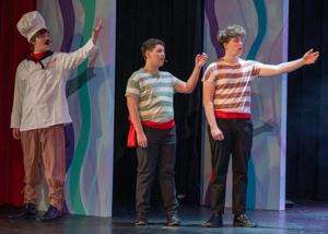 Chef Louis, played by Matthew Hauck, and sailors, Luke Resh and Lukas Yencha, wave goodbye to the married couple, Ariel and Prince Eric in “The Little Mermaid JR.”