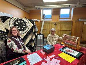 Eileen Haas and Shirley Yeager sell raffle tickets for the queen-size quilt made by the church crafters.