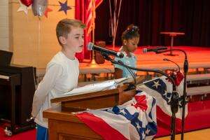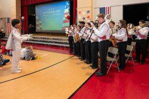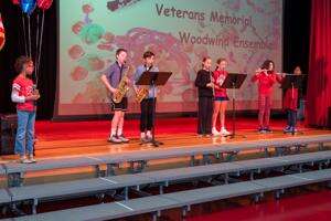 The Veterans Memorial Elementary School Woodwind Ensemble, including: Camryn Walker Achenzie (vocal soloist), Ryan Walker, Ian Musheno, Sash Scarpero, Reagan Fanslau, Evelyn Mimms and Hamiska Keerthi perform “My Country ‘Tis of Thee” during the Veterans Day program.