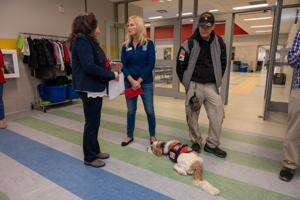 PRESS PHOTO BY LOU WHEELANDVeterans Memorial Elementary School music teacher Christine Lerew talks with Tails of Valor Founder and Executive Officer Heather Lloyd before the Veterans Day program at Veterans Memorial Elementary School, 250 Twin Ponds Road, Breinigsville, Nov. 9. Former Army Sgt. Patrick Mount and his support dog “Decker” meet veterans as they enter the school.