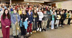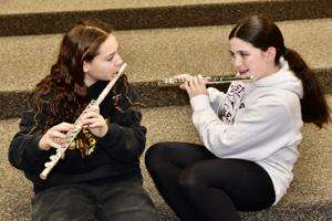 Press photos by Dana GrubbAllison and Julia rehearse ‘Let it Snow’ on their flutes before outdoor marching practice.