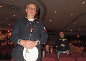 ABOVE: Veterans are honored at the special assembly and given red carnations by the cadence choir.