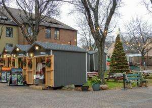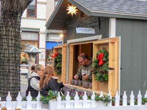 Holiday-themed wooden huts, all adorned with Moravian stars, are at the hub of the festive atmosphere.