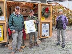 Bob Wingrove, executive director of The Freezer Ministry and Garden Gatherers Inc., center, is flanked by Gary Marsh and Karen Montgomery at the hut sponsored by The Freezer Ministry and Garden Gathers and Bethlehem Emergency Sheltering. The organizations teamed up to host the hut to support the fight against homelessness and hunger. The trio, volunteers with The Freezer Ministry and Garden Gatherers and BES, were doling out hot apple cider, cookies and information and accepting donations for the all-volunteer organizations. “Since Covid, we’ve donated over a half million meals valued at over $1.5 million at an evaluation of $3 per meal,” Wingrove said of The Freezer Ministry and Garden Gatherers, an ecumenical/community program. Wingrove is displaying information on The Stars of Bethlehem Holiday Concert and Reception, a fundraiser for The Freezer Ministry and Garden Gatherers Dec. 16 at the historic Chapel of Central Moravian Church and Hotel Bethlehem. The BES shelter is located at Christ Church United Church of Christ, 75 E. Market St. The organizations are offering concerts next to their hut in close proximity to The Sun Inn throughout the run of Christmas City Village. Those interested in performing may contact Wingrove at robert.wingrove@rcn.com.
