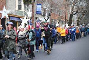 PRESS PHOTO COURTESEY OF JOEY HARTMAN-DOWWalkers hit their stride on Main Street, Nazareth, during the 60th annual Christmas Peace Pilgrimage in 2019. This year’s walk is slated for Dec. 13. People making this Christian witness for peace have been making the 10-mile trek from Nazareth to Bethlehem along Route 191 the second Saturday in December for 66 years. Symbolic of the journey of Mary and Joseph, it is the world’s oldest annual peace witness, during which pilgrims seek to reflect the nonviolent life of Jesus Christ and his truth of forgiving love. Walkers will meet in the parking lot at 529 E. Broad St., Bethlehem, with buses leaving promptly at 10:45 a.m. to transport pilgrims to Nazareth Moravian Church. There are two scheduled rest stops with light refreshments at Trinity Lutheran Church, Nazareth and First Baptist Church, Bethlehem, and a candle lighting at College Hill Moravian Church, Bethlehem at 4:30 p.m. A Carol Singing at Payrow Plaza at 5 p.m. will be followed by fellowship, conversation and a simple supper at Christ Church United Church of Christ at 75 E. Market St. at approximately 5:30 p.m. Walkers may join the pilgrimage anywhere along the way, and are encouraged to dress appropriately for the weather – pilgrims walk in sun, wind, rain or snow. Support vehicles – known as shepherds – are available to pick up those who would like assistance for part of the way or a ride back to their vehicles. People may also make a monetary donation to support the financial expenses of the walk, such as bus rental, police escort and food. “Come walk with us this holiday season and discover why one of the reasons Bethlehem is called The Christmas City!” Nancy Johnston, a member of the pilgrimage planning committee who has been involved with the pilgrimage since 1986, said. “Walking the journey from Nazareth to Bethlehem we experience a link to history and becoming pilgrims of peace.” For more information or to register for free visit peacewalk.org/. BY TAMI QUIGLEY