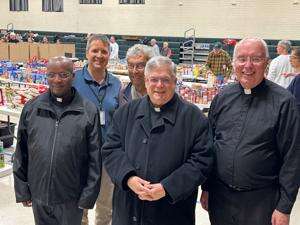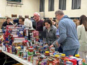 Committee Chair Derek Demchak and his team had 75 registered volunteers for the event; however, over 100 volunteers were available to serve. Demchak said approximately 7,000 pounds of goods were donated by the parishioners to be packed into 200 boxes.