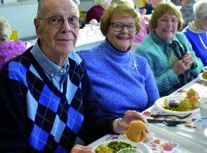 Emmaus residents Don and Joie Wenner, along with close friend Lis Cassler enjoy their turkey dinner in the high school cafeteria.
