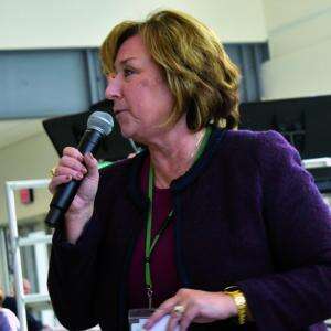 Emmaus High School Principal Beth Guarriello welcomes the community seniors at the Thanksgiving luncheon and announces an upcoming student-run Tech Connect workshop for Dec. 3.