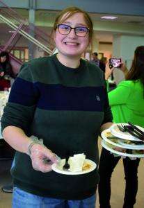 Jadie Wallace and Reid Siminski serve up dessert at the annual holiday lunch.