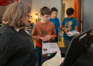 ABOVE: Shari Spark, coordinator, The Holocaust Resource Center of the Jewish Federation of the Lehigh Valley introduces Orefield Middle School students William Pure, Xavier Garcia and Habib Mudahl to Lucienne, a Jewish German woman who was lost during the Holocaust at the Legacy Exhibit.