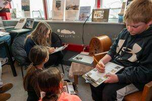 PRESS PHOTOS BY LOU WHEELANDQuinn Griffin, Ava Greco, Madelyn Raymar and Emerson Cahoon listen to a radio broadcasting news from World War II while attending the Legacy Exhibit depicting the Holocaust presented by the Holocaust Resource Center of the Jewish Federation of the Lehigh Valley.