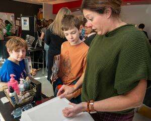 Sawyer Aberman and William Pure look at a book containing six million entries representing the number of Jews lost during the Holocaust. The only entry is “Jew,” repeated six million times. Sixth grade reading teacher Candice Ottaviani shows the students the book during the Legacy Exhibit.