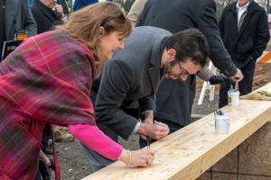 Laurie Hackett, Upper Macungie Township Community Fund and State Rep. Mike Schlossberg, D-132nd, sign the ceremonial top beam during the topping off ceremony of the new Upper Macungie Township Community Lifestyle Center.