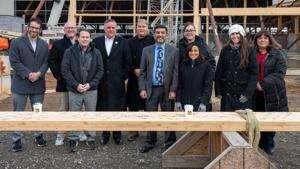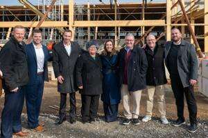 Elected officials attending the topping off ceremony at the new Upper Macungie Township Community Lifestyle Center include State Rep. Mike Schlossberg, D-132nd, Jeff Fleischaker, chairman, Upper Macungie Township Board of Supervisors, State Sen. Jared Coleman, R-16th, State Rep. Gary Day, R-187th, Jim Brunell and Sunny Ghai, Upper Macungie Township Board of Supervisors, Sheila Alvarado, commissioner, Lehigh County, Fabia Halma, PA DCED, Sara Baran, representing U.S. Congressman Ryan Mackenzie and Carol Facchiano, Parkland School Board. They are shown with the ceremonial top beam with all attendees signatures.
