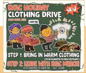 Contributed photoLehigh Valley Apparel Creations is known for printing T-shirts, promoting live music concerts, hosting wild professional wrestling events, and also for having a big heart. The screen printing company, located at 151 N. Chestnut St. in Bath is hosting their annual clothing drive again this year. Until Dec. 31, anyone who drops off something warm to donate to New Bethany will get a free LVAC sweatshirt or tee to take home. Owner Chris Regec said, “People need community more than ever right now. I hope this can be an opportunity for folks to give some support to people who need it and to inspire others to get involved in all sorts of ways.” So drop off something warm at the shop, get something cool in return, then get out there and fight the good fight. Now that’s the holiday spirit!