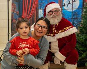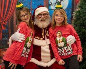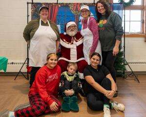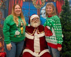 Who says anyone is too old to visit with Santa? Brittany Cordera and her mom, Cindy Grub, of South Whitehall, show their Christmas sweaters with Kris Kringle during the pancake breakfast and visit with Santa.