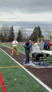 A student gets ready to pie McNulty. Students also played Minute To Win It games and entered their Rider Bucks in a raffle to earn gift cards.