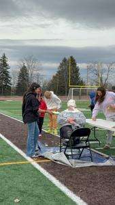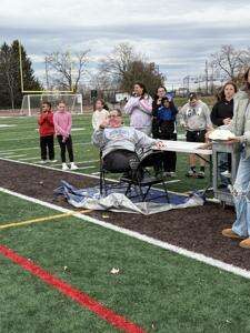 CONTRIBUTED PHOTOSMcNulty gives two thumbs up after having been pied in the face multiple times by students.