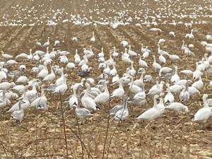 In case you haven’t seen them, snow geese have arrived. I spotted a sizable flock (with a few Canada geese mixed in) last week in a field on Mauch Chunk Road on land that belongs to GES (Trojan Powder Company). Earlier in the week I likely saw the same flock flying East towards a quarry outside of Northampton that they annually put down on. It’s amazing how they remember that spot year after year. The resident population zone regular season for them runs until Feb. 21 and the conservation season until April 24.