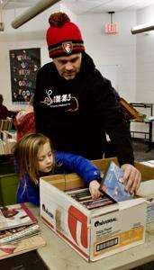 RIGHT: Ada Jacobs gets a helping hand from her dad, Matthew, as she searches for a good book in the children’s section at the sale.