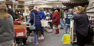 ABOVE: A crowd of patrons surround tables loaded with books, puzzles and CDs during the Emmaus Public Library holiday book sale.