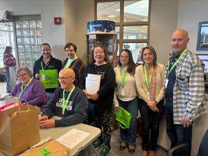 Helpers at the book sale include: seated, Joyce and Tony Santag; standing, left to right: Sarah Modrick, Susan Nanstiel, library director Kathee Rhode, Julie Smith, Dawn Dotersztyn and Bill Parsell.