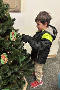 On Dec. 12, the second grade classes at Salisbury Elementary School walked to the Salisbury Township School District administration building and hung ornaments on the tree in the lobby, sang a song to the staff and received a tour of the building from Superintendent Lynn Fuini-Hetten. RIGHT: Ethan Rodas hangs an ornament on the tree at the Salisbury Township School District administration building.Additional photos appear on Page A6.PRESS PHOTO BYREBECCA FOEHRKOLB