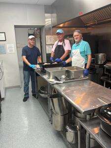 St. John’s UCC volunteers Don Kaufman, Mike Andrews and Tom Gaffe help prepare the pork and sauerkraut dinner.